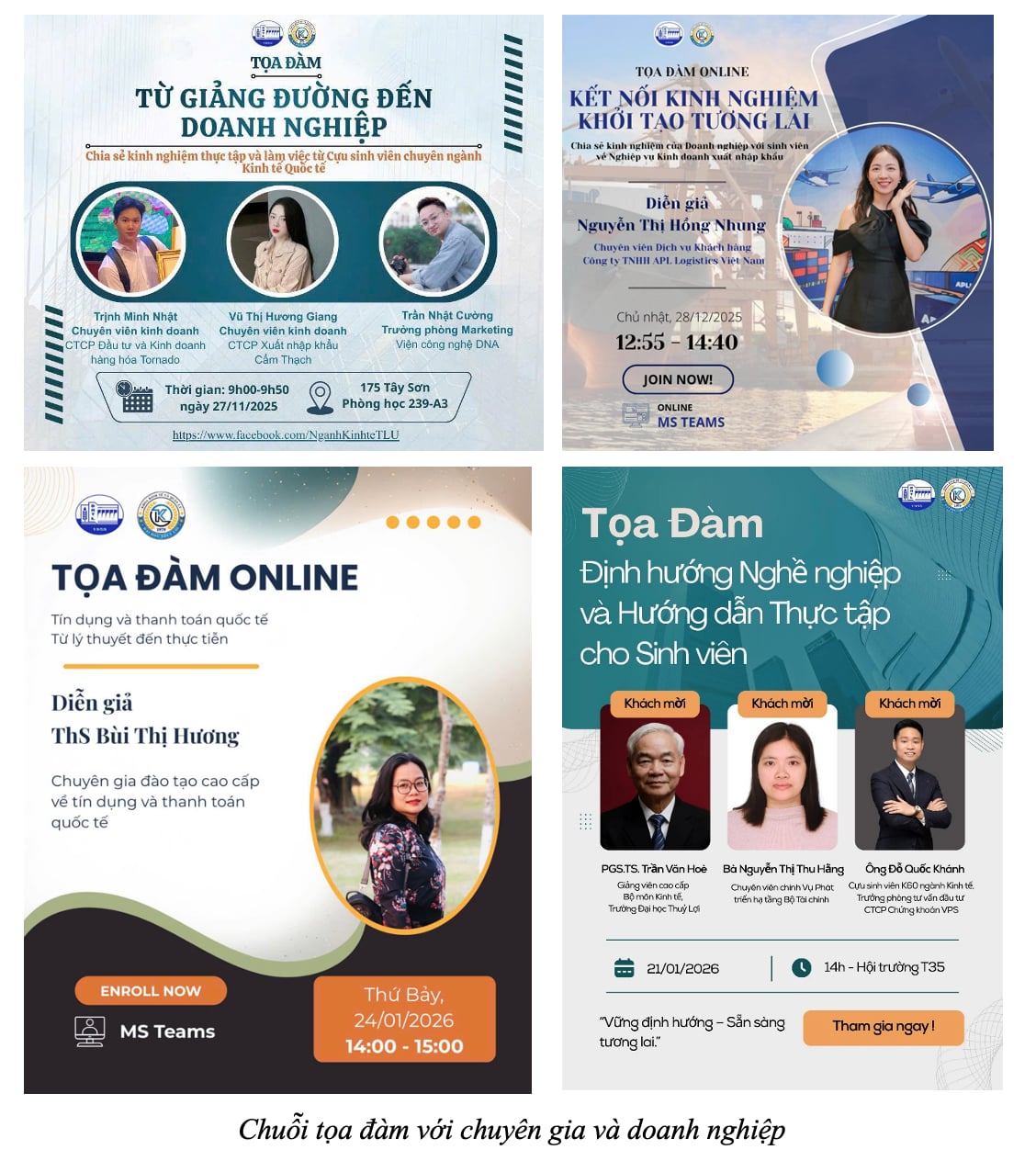 Các chương trình định hướng nghề nghiệp được tổ chức định kỳ mở ra cái nhìn đa chiều về thị trường lao động, từ những phân tích chuyên sâu về thuế quan và sự dịch chuyển chuỗi cung ứng đến những yêu cầu thực tế đối với nhân sự từ góc nhìn của cơ quan nhà nước và và doanh nghiệp, giúp sinh viên xây dựng la bàn kiến thức và bản đồ nghề nghiệp rõ ràng ngay trên ghế nhà trường.