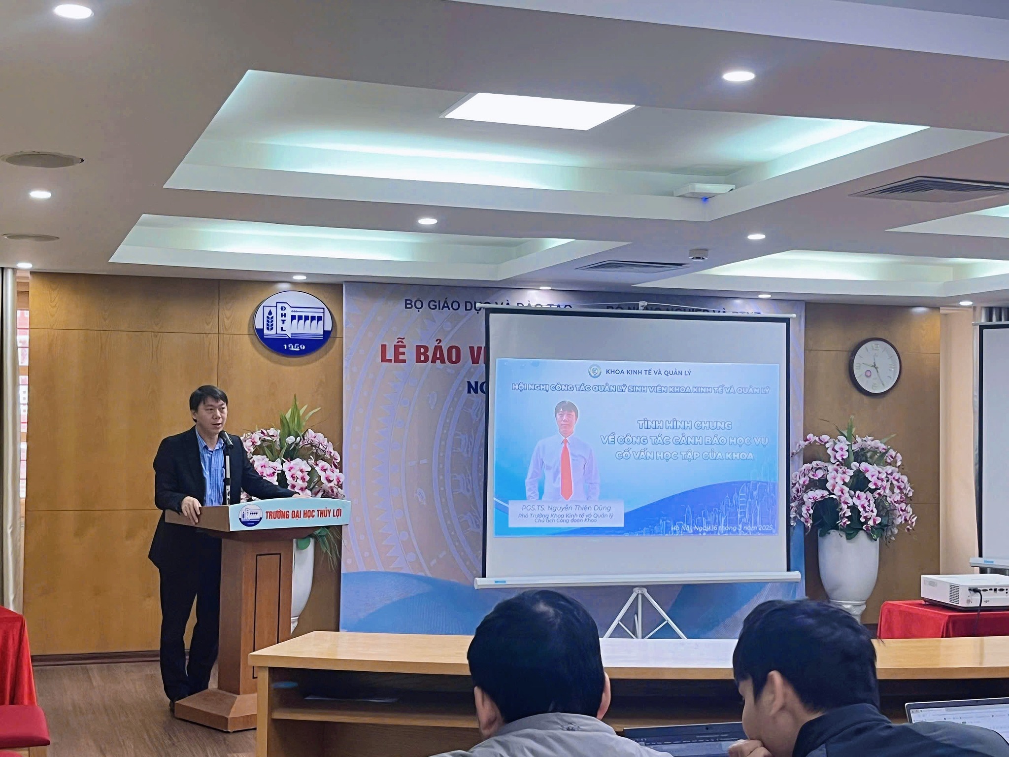 Mở đầu hội nghị, PGS.TS Nguyễn Thiện Dũng trình bày tình hình công tác cảnh báo học vụ, cố vấn học tập, nhấn mạnh vai trò của CVHT trong việc định hướng và hỗ trợ sinh viên.