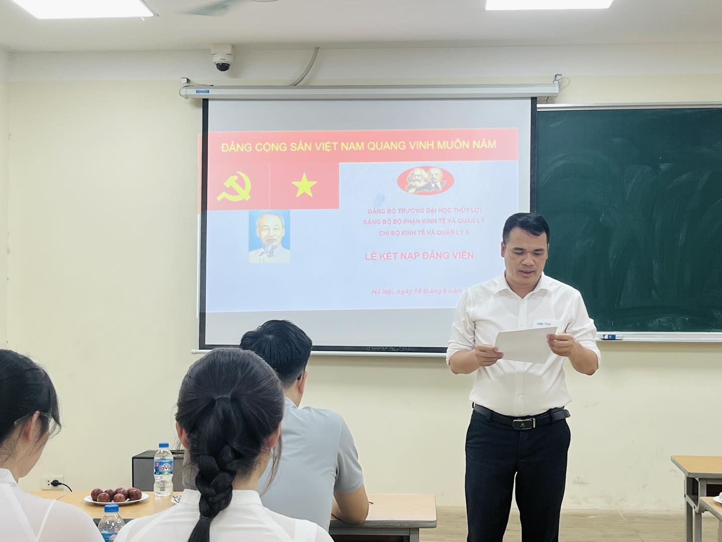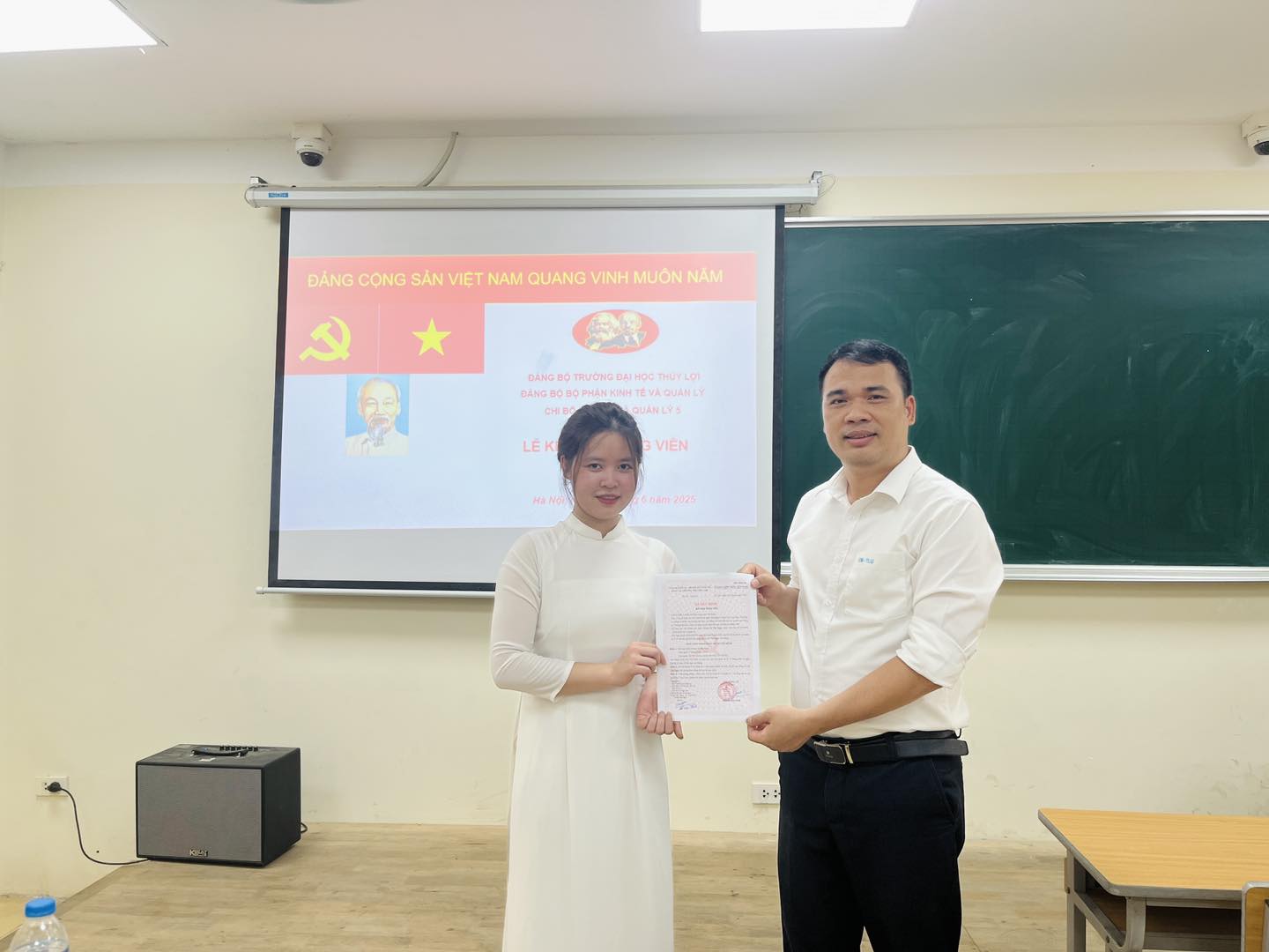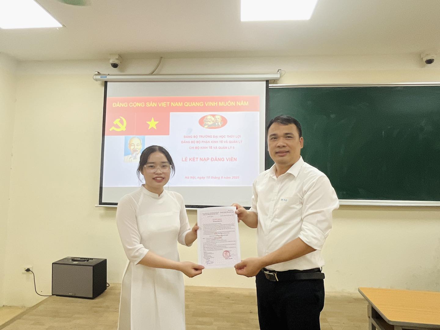 Ngày 10 tháng 6 năm 2025, Chi bộ Kinh tế và Quản lý 5 – thuộc Đảng bộ Trường Đại học Thủy lợi – đã long trọng tổ chức Lễ kết nạp Đảng viên cho hai quần chúng ưu tú: Lê Thị Ngọc và Phạm Thị Thu Vân, sinh viên lớp 64KTXD4. Buổi lễ được tổ chức trong không khí trang nghiêm, đúng quy định của Điều lệ Đảng, là một sự kiện mang ý nghĩa chính trị sâu sắc, đánh dấu bước trưởng thành mới của các quần chúng ưu tú sau thời gian dài rèn luyện, phấn đấu không ngừng.