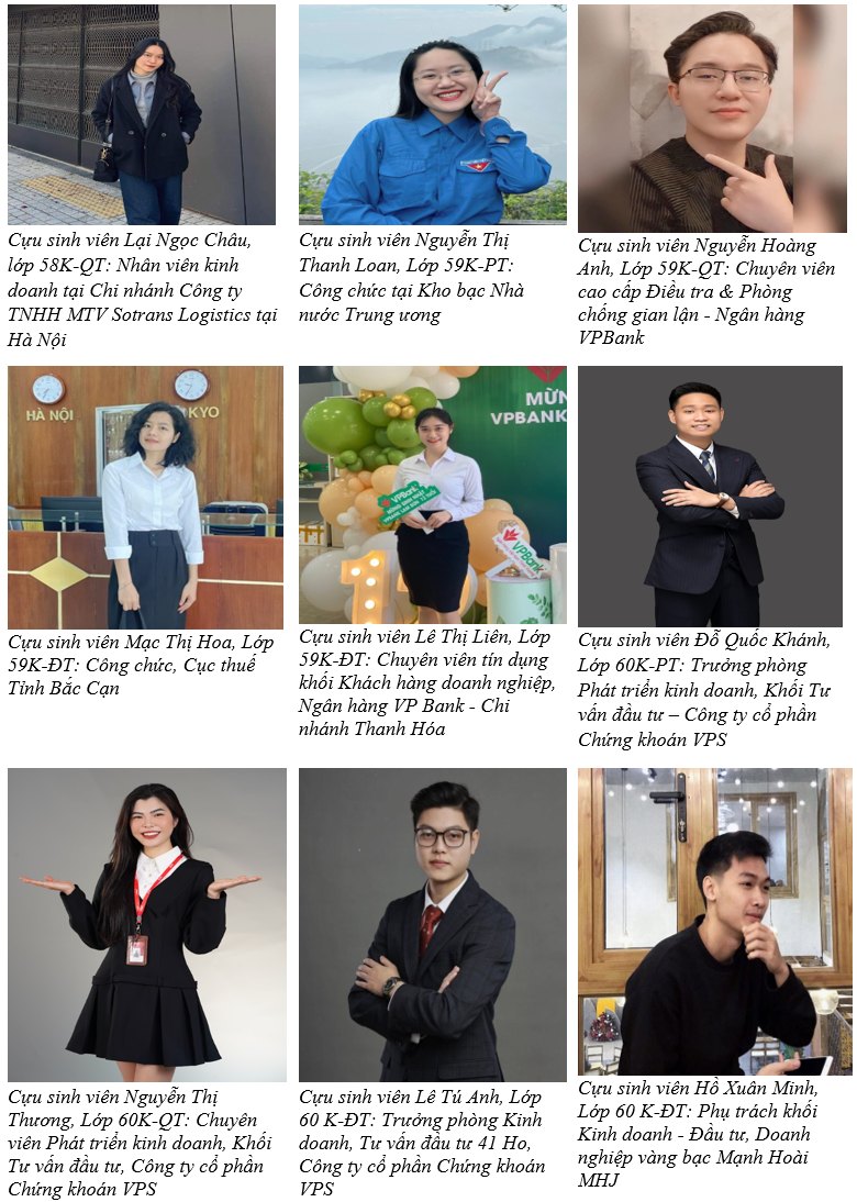 Với 4 chuyên ngành đào tạo gồm Kinh tế Phát triển, Kinh tế Quốc tế, Kinh tế Đầu tư và Kinh tế Tài nguyên thiên nhiên, cơ hội việc làm của sinh viên ngành Kinh tế ngày càng rộng mở với trên 90% sinh viên ra trường có việc làm phù hợp sau khoảng 1 năm tốt nghiệp. Thực tế cho thấy, nhiều sinh viên tốt nghiệp ngành Kinh tế, đã và đang từng bước khẳng định được vị trí và vai trò của mình ở nhiều lĩnh vực kinh tế đa dạng, phù hợp với ngành đào tạo. Dù đã tốt nghiệp ra trường nhiều năm nhưng các sinh viên vẫn thường xuyên kết nối với các thầy cô và các hoạt động của Bộ môn Kinh tế. Dưới đây là một số gương mặt cựu sinh viên ngành Kinh tế của Trường Đại học Thủy lợi đã tốt nghiệp khoảng 5 năm trở lại đây.