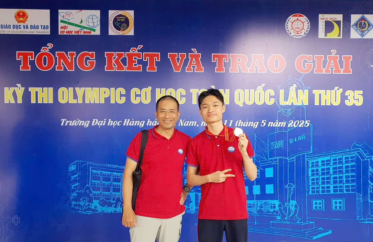 Hai bạn cùng thầy cô và các bạn tham gia Olympic cơ học toàn quốc năm 2025