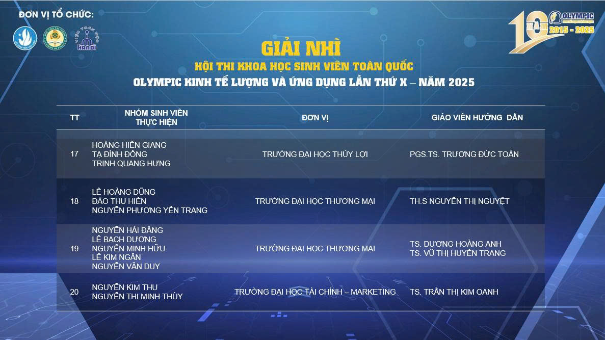 Nhóm sinh viên ngành Kinh tế đã xuất sắc giành Giải Nhì tại Hội thi Khoa học sinh viên toàn quốc Olympic Kinh tế lượng và Ứng dụng lần thứ X – năm 2025. Đây là một cuộc thi học thuật quy mô toàn quốc, quy tụ các nhóm sinh viên đam mê nghiên cứu định lượng trong lĩnh vực kinh tế từ các trường đại học hàng đầu cả nước.