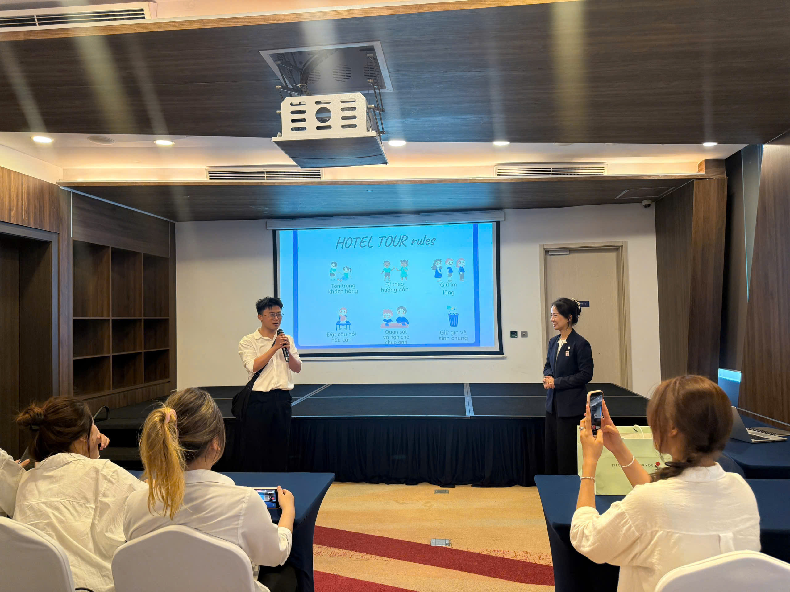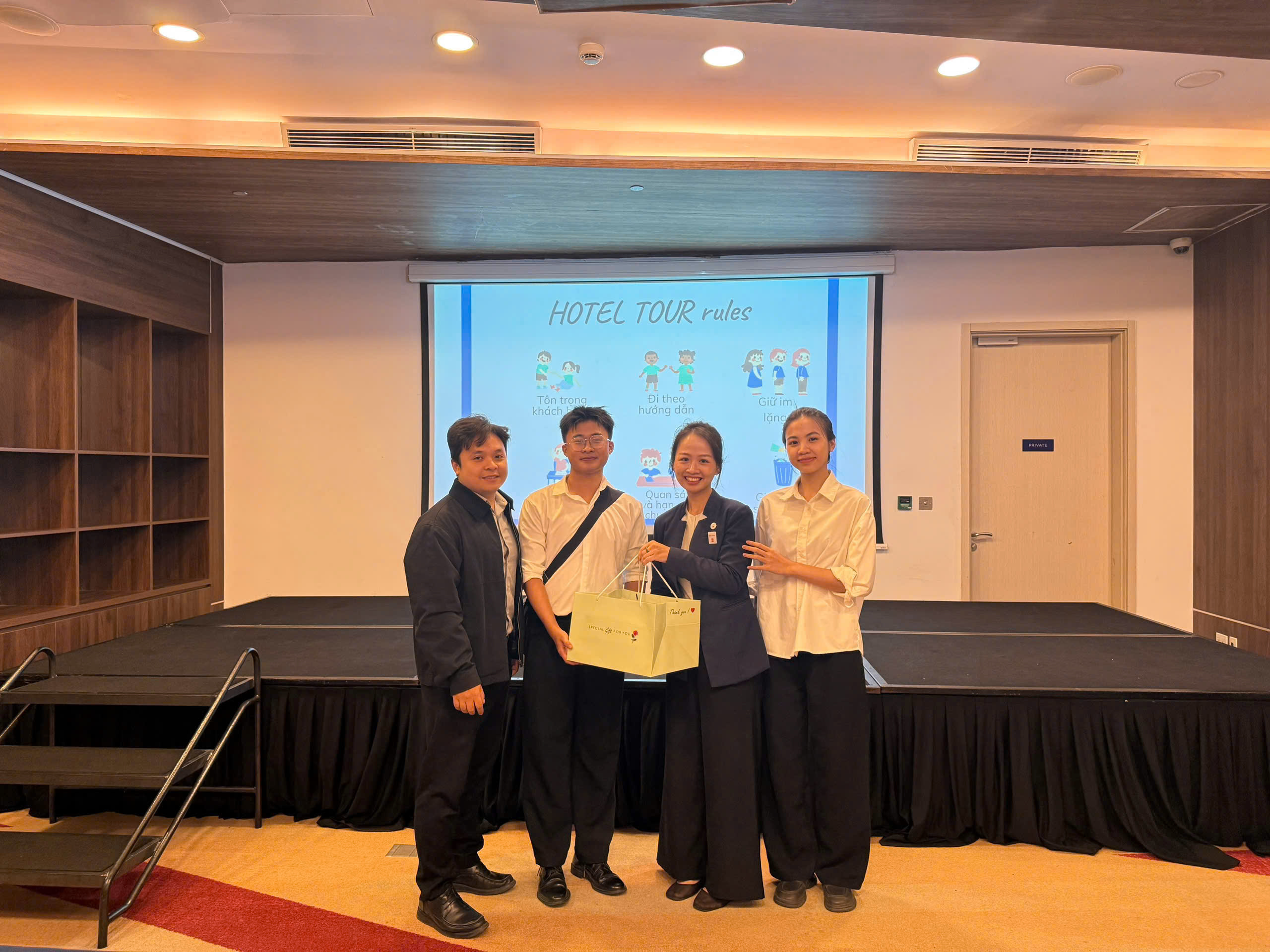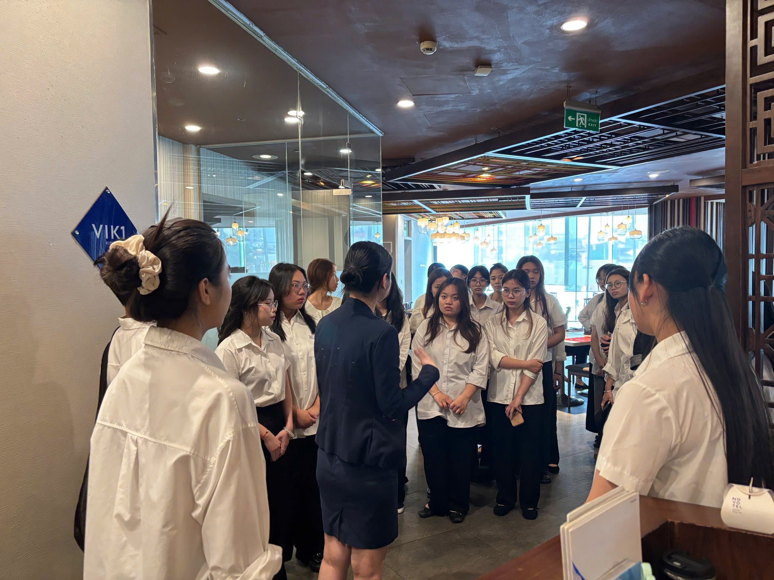 Ẩm thực và Sự kiện: Đoàn đã dành nhiều thời gian tại hệ thống nhà hàng và khu vực Ballroom (phòng đại tiệc). Tại đây, sinh viên được lắng nghe về cách tổ chức tiệc, quy trình phục vụ bàn chuyên nghiệp và cách vận hành các sự kiện MICE (du lịch kết hợp hội nghị).