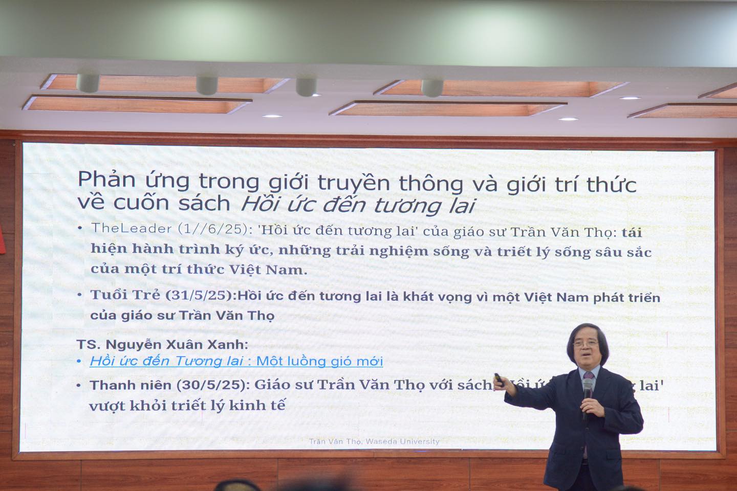 Song song với phần chia sẻ học thuật, Giáo sư Trần Văn Thọ đã trân trọng giới thiệu đến đông đảo giảng viên, sinh viên, độc giả và các nhà nghiên cứu cuốn sách mới nhất của ông – “Hồi ức đến tương lai”. Đây không chỉ đơn thuần là một ấn phẩm tri thức, mà còn là công trình kết tinh giữa những trải nghiệm thực tiễn phong phú, quá trình nghiên cứu sâu sắc cùng với tầm nhìn chiến lược và khát vọng không ngừng nghỉ cho sự phát triển bền vững của đất nước.