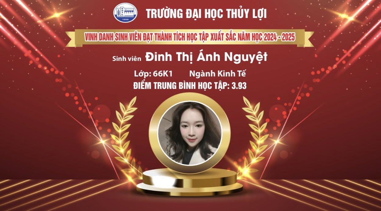 Danh hiệu Sinh viên xuất sắc nhất Ngành năm học 2024–2025 được trao cho sinh viên Đinh Thị Ánh Nguyệt, lớp 66K1.
